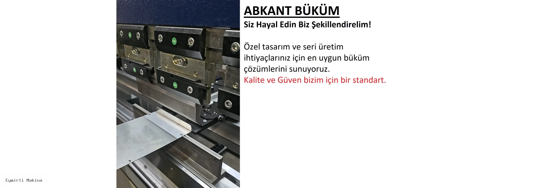 Eymirli Makina olarak, metal işleme sektöründe yılların deneyimi ve teknolojik altyapımızla müşterilerimize yüksek kaliteli çözümler sunuyoruz. Abkant büküm, kaynaklı imalat, CNC lazer kesim, torna ve freze hizmetlerimiz ile sanayinin farklı alanlarında güvenilir üretim yapıyoruz.